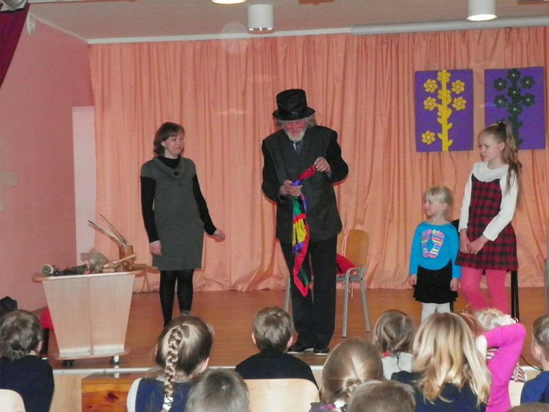 Pamokėlės – koncerto linksmoji dalis - iliuzionisto A. Guduko pasirodymas. Stebukladarys ne tik pats parodė keletą smagių triukų, bet ant scenos kartu papokštauti kvietė ir mokinius bei mokytojas.