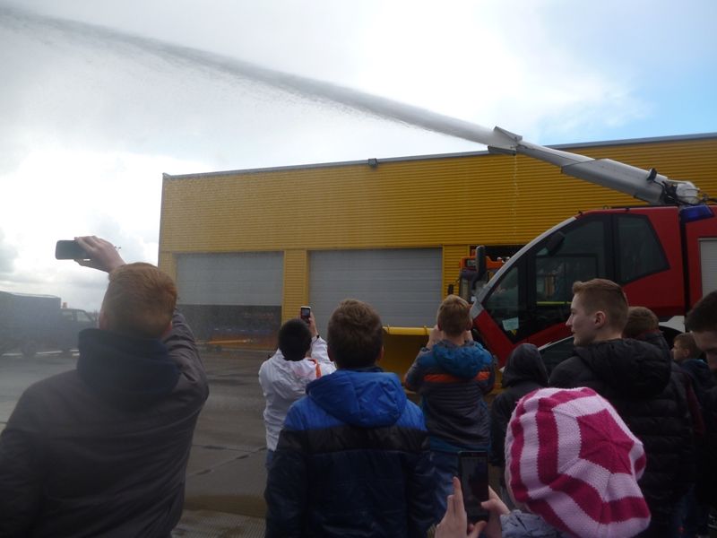 „Kelionės“ pabaigoje apsilankėme technikos, kurios pagalba yra tvarkomas „pakilimo-nuleidimo“ takas, garažuose. Pamatėme gaisrinės mašinas. Gaisrininkas pademonstravo vienos mašinos galimybes.