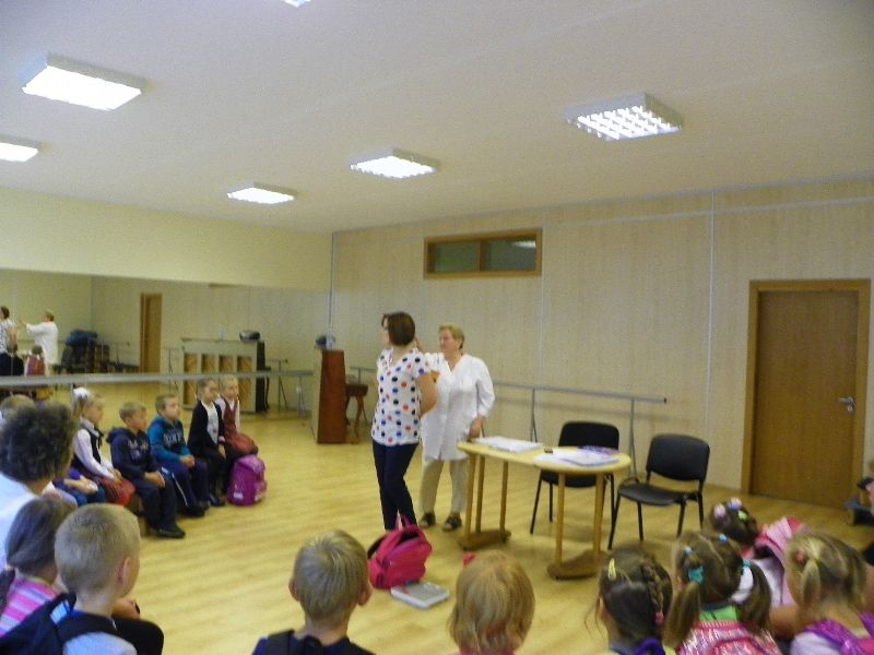 Sveikatos priežiūros specialistė J.Salabudo pirmokams paaiškino, kokią neigiamą įtaką sveikatai turi per sunki ir netaisyklingai nešiojama kuprinė.