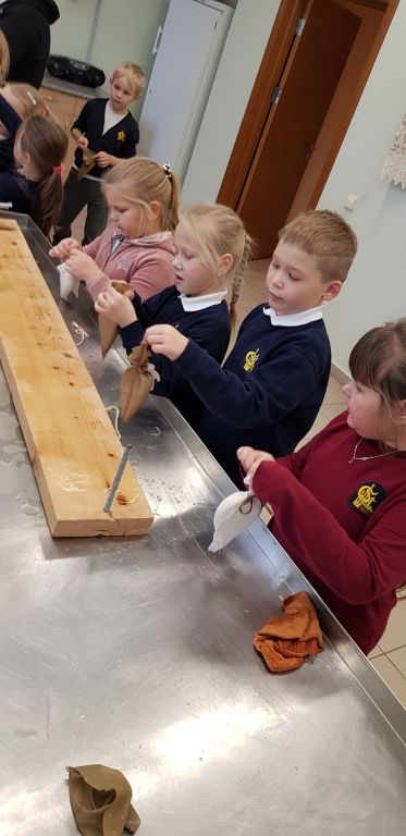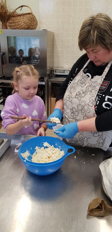 1B KLASĖS MOKINIAI SPAUDĖ SŪRĮ DARGUŽIŲ AMATŲ CENTRE