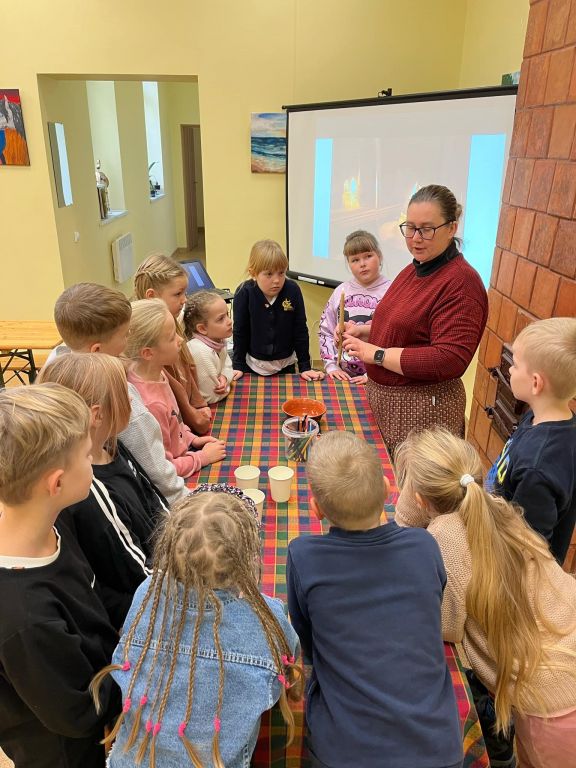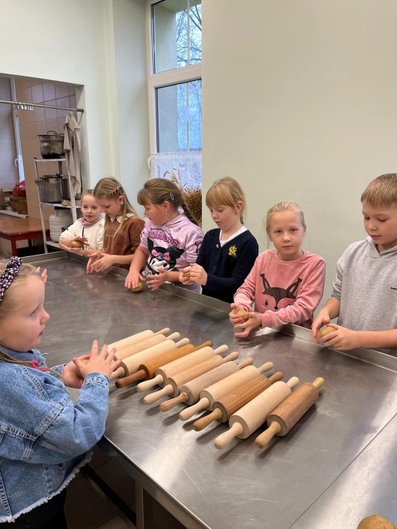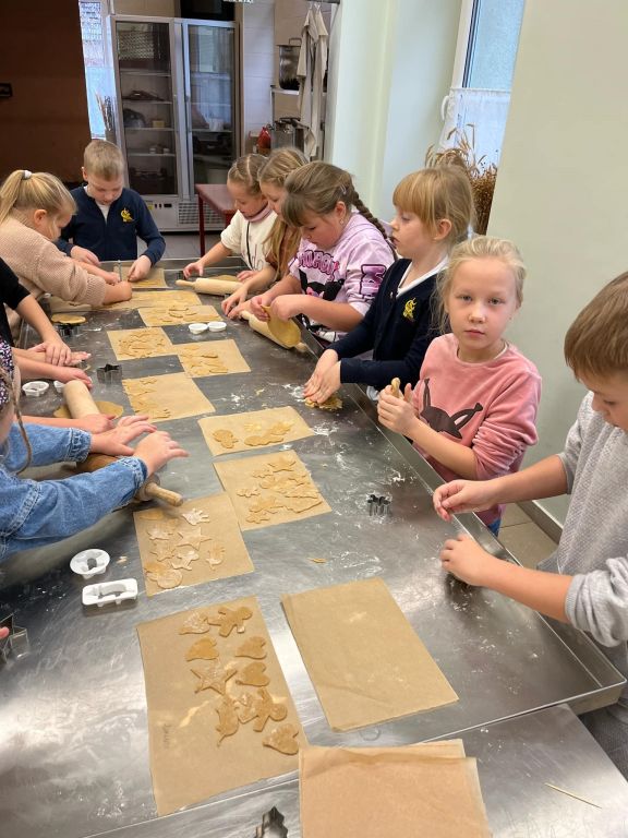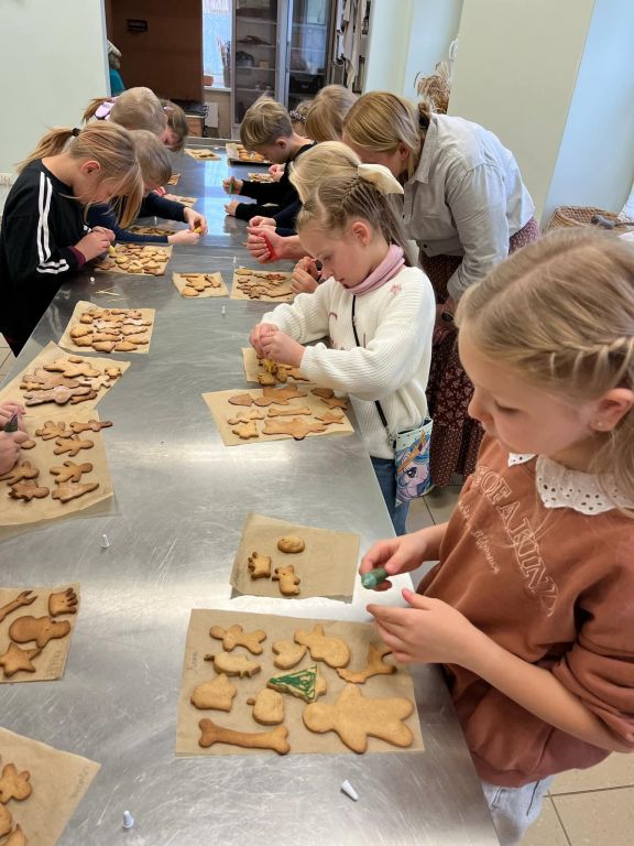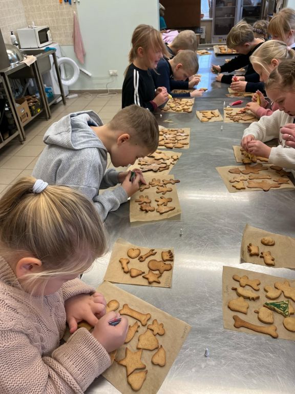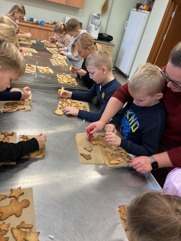 Kepėja Roberta paaiškino, kaip užminkyti imbierinę tešlą, kaip paruošti tešlą sausainių kepimui. Kiekvienas mokinys paruoštą tešlą iškočiojo ir, pasirinkęs norimą formelę, formavo sausainius. Kol sausainiai kepė, mokiniams amatų centro vedėja Sigita pasakojo apie Kūčių tradicijas ir papročius. Antrokai sužinojo apie Kūčių patiekalus, stalo serviravimą, o labiausiai mokiniams patiko burtai!