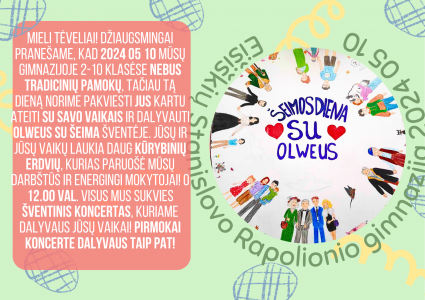 Esame OLWEUS vardo mokykla. Didžiuojamės šiuo vardu! Ir nors patyčios nuolatos skverbiasi į mūsų gyvenimą ir kelią mums iššūkius, mes tikime, kad vieną dieną jų tiesiog neliks, nes tai rūpi visiems mūsų bendruomenės nariams.