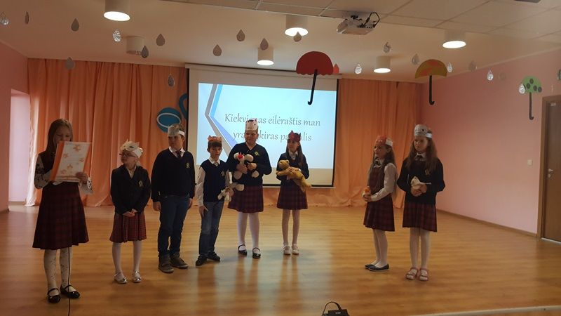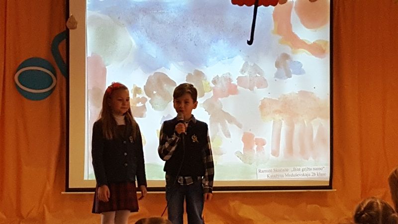 Renginio pradžioje nuskambėjus dainai ,,Mama ir saulelė“, mes, šeštokai (aš, Samanta, ir Donatas) pasakojome apie poetės gyvenimo ir kūrybos kelią, pristatėme jos parašytas knygas ir pelnytus apdovanojimus. Klausydamiesi pasakojimo apie Ramutę Skučaitę mokiniai išvydo ne vieną besišypsančios poetės jaunystės ir vėlesnių gyvenimo metų nuotrauką. Bibliotekos vedėja M.A.Dailydkaitė papasakojo apie skaudžius poetės išgyvenimus, patirtus Sibire. Lietuvių kalbos mokytoja B. Lukaševičienė visiems priminė, kaip gražiai rašo poetė, ir pakvietė vaikus padeklamuoti poetės eilėraščius. Visos klasės, kurios dalyvavo renginyje, - pradinukai, penktokai ir šeštokai – pristatė R.Skučaitės knygeles, kurias kartu skaitė, ir padeklamavo mintinai išmoktas eiles. Šeštos klasės mergaitės skaitė eilėraščius iš knygelės ,,Aš esu – kas?“. Manau, kad visiems labai patiko eilėraščiai apie mažą Pabaisą - Pabaisėlį, kuris iš tikrųjų buvo labai geras ir mielas.