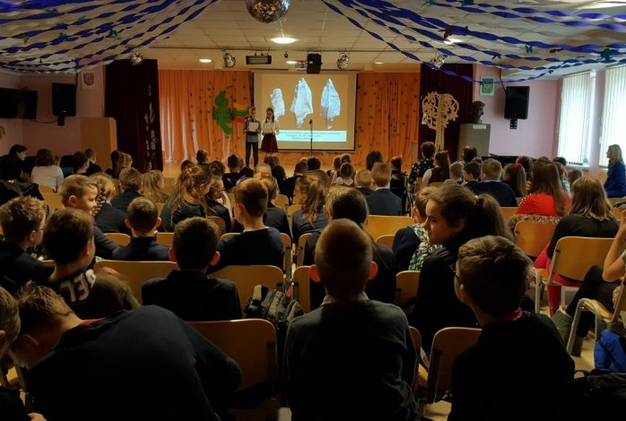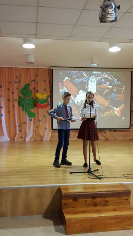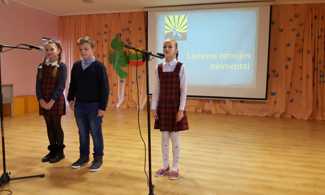 Renginio vedėjai, 6 klasės mokiniai Aistė Malinovska ir Romas Talmontas, pasitelkdami vaizdus, priminė Lietuvos vardo kilmę. Visi kartu prisiminėme, kokį sunkų kelią nuėjo Lietuva nuo akmens amžiaus iki Nepriklausomybės atkūrimo dienos.